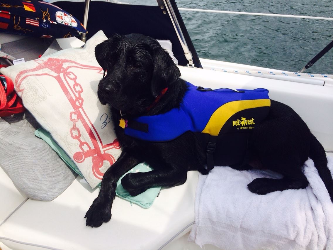 LGPS members Cathy Pettigrew & John Ives black lab Lady relaxes in her PFD